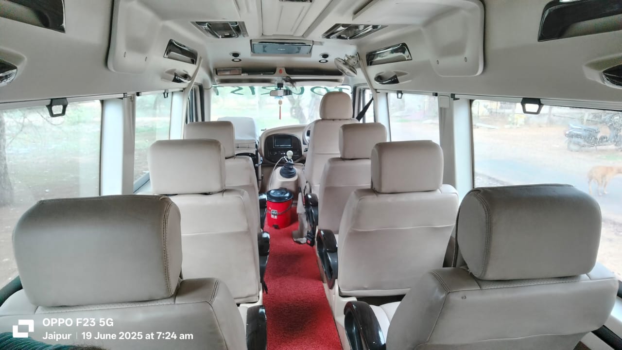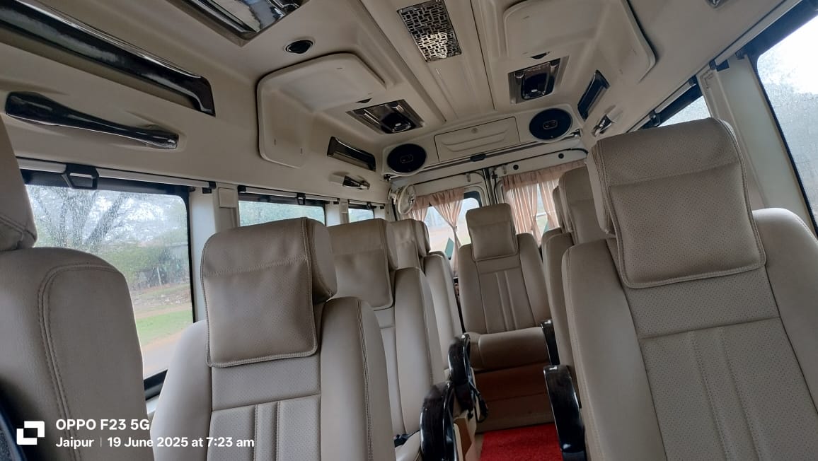 Our 12 Seater Tempo Traveller is perfect for medium-sized groups, offering a comfortable and spacious travel experience. Ideal for family trips, corporate tours, and outstation journeys.